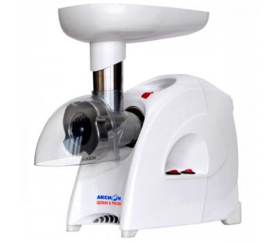 Электромясорубка Аксион М41.02 снабжена большим количеством насадок. В их число входят соковыжималки для цитрусовых и прочих фруктов, стандартный режущий блок с двумя сеточками, а также овощерезка с набором сменных лезвий. Кроме того, в комплект поставки включён пластиковый экран, защищающий пользователя от брызг.