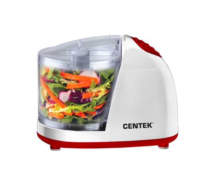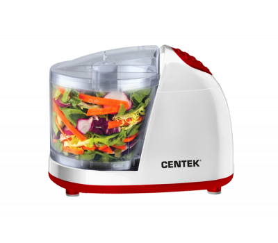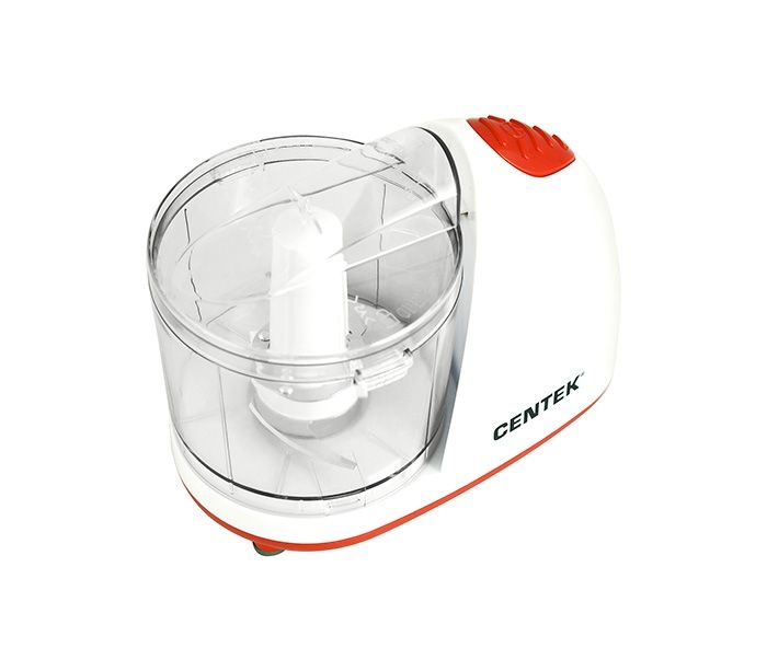 Измельчитель Centek CT-1390 представлен в компактном белоснежном корпусе с контрастными красными элементами.
