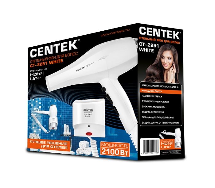 Модель Centek CT-2251 дополнена съемным фильтром и системой защиты от перегрева. Имеется возможность сушки холодным воздухом, а также настраивать скорость потока и уровень нагрева независимо друг от друга. Фен дополнен петлей для удобного подвешивания и спиральным не закручивающимся кабелем 2 м.