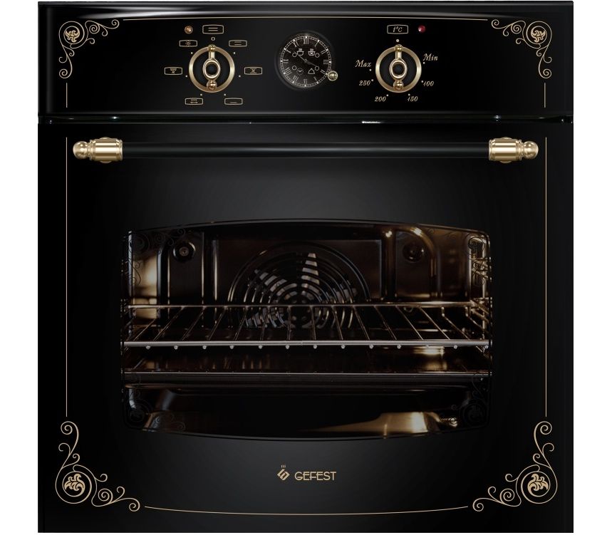 Электрический духовой шкаф с фасадом, покрытым черного кремового цвета. Дополнительно нанесен рисунок, декорирующий фасад в ретро-стиле, выступающие ручки также декорированы. В середине панели управления расположен аналоговый циферблат с часами и встроенным таймером. Внутреннее освещение - двухточечное, размещенное на противне блюдо прекрасно видно сквозь двойное стекло дверцы, нет необходимости открывать ее, выпуская жар. Съемные направляющие - для облегчения ухода за стенками шкафа. Классический термостатированный нагрев, конвекция работает и с электрическим грилем, значительно ускоряя разогрев духовки и позволяя готовить на нескольких уровнях одновременно.