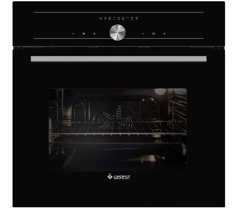 Черного цвета электрический духовой шкаф, современный дизайн, стеклянный фасад и большое количество встроенных функций. Управление осуществляется с помощью поворотного переключателя и сенсоров, помощью при готовке станут и автоматические программы.