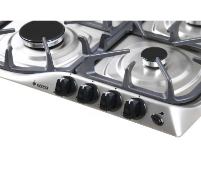 Ультрасовременная газовая варочная поверхность Gefest СН 1210 К5 может похвастаться оригинальным, но удобным исполнением. Конструкция этого прибора предусматривает независимый тип установки. Это значит, что устройство допустимо вмонтировать практически в любую, подходящую для этого, горизонтальную поверхность. Прибор оборудован классическим количеством горелок, а именно – четырьмя. Все они имеют разный диаметр, что позволяет готовить как в небольшой, так и многолитровой посуде. Во фронтальной части варочной поверхности расположены поворотные переключатели. Такое расположение панели управления делает варочную поверхность удобной и для правшей, и для левшей.