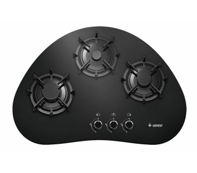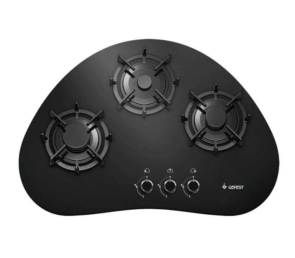 Черного цвета газовая варочная панель нестандартного вида и размера, со стеклянной поверхностью. Три конфорки (экономичная, средняя, большая) оснащены газ-контролем и автоматическим электроподжигом, встроенным в переключатели. Горелки защищены фигурными чугунными решетками. Управление - простое, механическое и не вызывает затруднений, есть фиксированное положение для экономного горения. Сама панель смотрится интересно, готовить на ней - удобно.