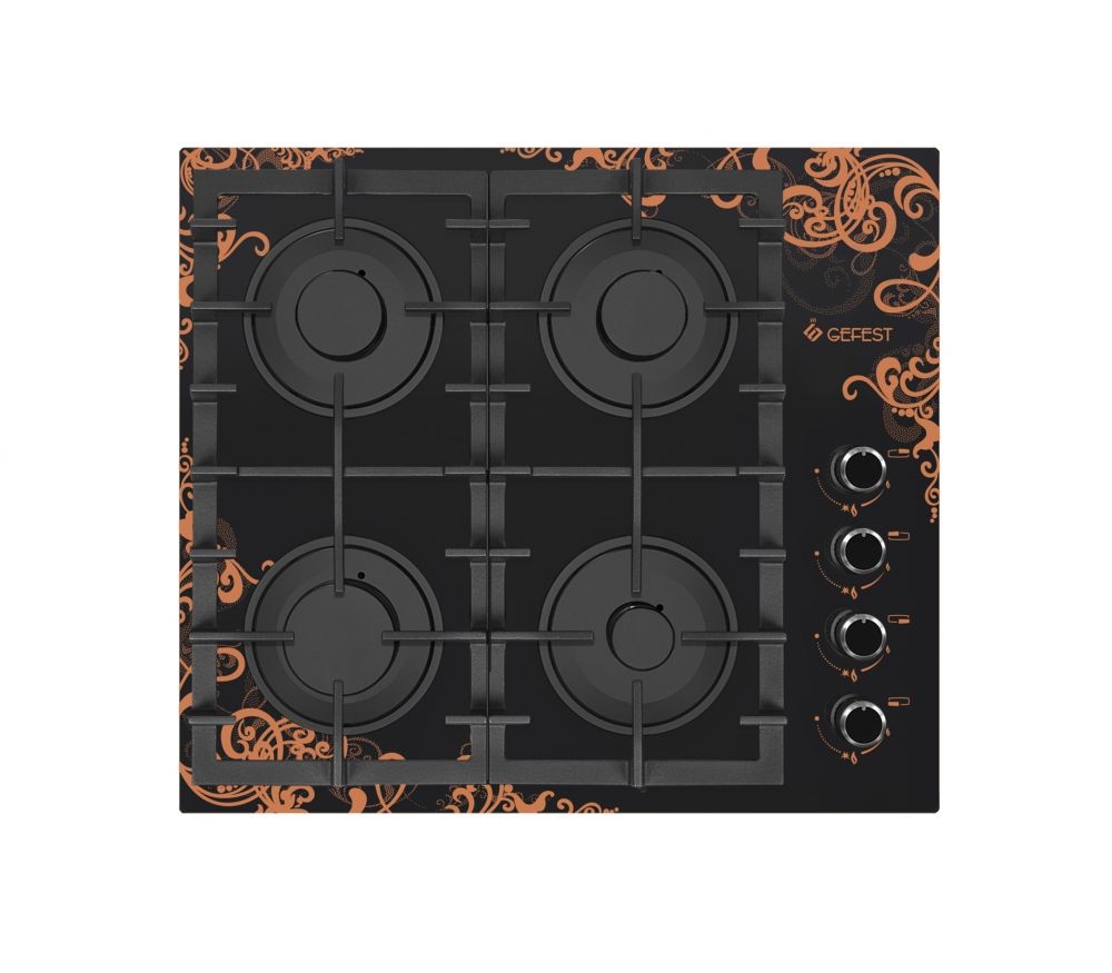 Газовая варочная панель шириной 60 см, стеклянная рабочая поверхность - черного цвета. Декорированные ручки, на стекло нанесен рисунок. Управление газовыми горелками осуществляется поворотными переключателями, вынесенными на край панели. Мощность горения определяется пользователем прибора самостоятельно, для экономного горения предусмотрено фиксированное положение - малое пламя. Четыре конфорки (две стандартные, большая и малая) оснащены автоматическим электроподжигом, встроенным в ручки управления и газ-контролем. Фигурные чугунные решетки надежно защищают горелки и выдерживают вес тяжелой металлической посуды.