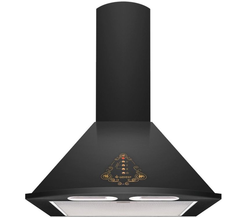 Каминного типа вытяжка черного цвета, ширина 60 см. Панель управления расположена на купольном фасаде, украшенном рисунком, предусмотрены таймер и световая индикация. Во время готовки можно включить дополнительное освещение, это делает процесс комфортным. Максимальная производительность до 1000 м3/ч в вытяжном режиме, вытяжка может работать и в замкнутом цикле (рециркуляционном). Уровень шума не более 66 дБА.