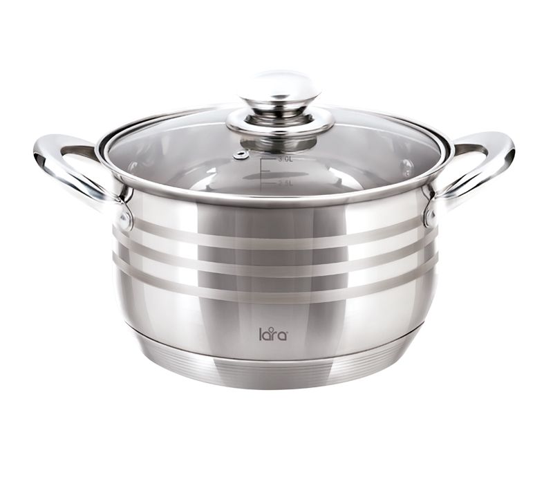 Lara LR02-581 Sonata предусматривает наличие крышки из жаропрочного стекла. В ее центре расположена ручка, за которую можно взяться при открывании крышки. Особенность кастрюли в поддержке 5-слойного капсулированного дна, благодаря чему тепло распределяется равномерно по поверхности, гарантируя равномерное прогревание продуктов внутри посуды. Это позволяет блюдам готовиться намного быстрее и качественнее. Индукционное дно делает кастрюлю той посудой, которую можно будет использовать на любой плите.