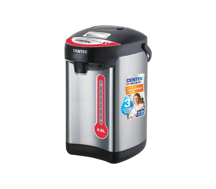 Термопот Centek CT-0081 с мощностью 750 Вт совмещает функции чайника и термоса. Он способен кипятить воду и поддерживать ее высокую температуру на заданном уровне длительное время. Объем резервуара для воды равен 4 л. Вода подается при помощи ручной помпы или электронасоса. Термопот в корпусе из металла и пластика поддерживает два режима работы: автокипячение и поддержание температуры.